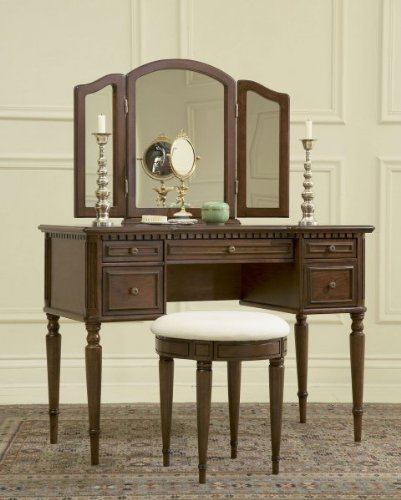 This beautifully styled vanity features a tri-fold mirror and accompanying round stool. It's constructed of solid wood with rich cherry veneers with a warm cherry finish. The dentil molding frame on the underside edge is accented with five working drawers resting on gently turned spindle legs. Drawer faces feature fluted, raised columns and decorative antique brass finished knobs. The round stool has turned spindle legs and a thickly upholstered beige fabric cushion. Some assembly required.