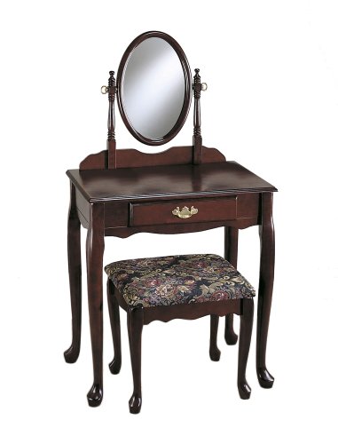 Enchanting vanity features an adjustable mirror and full size drawer. Tabletop provides space for cosmetics and beauty supplies. Lovely matching floral upholstered bench. "Nostalgic Oak" finish is accented with brass plated hardware. Charming Queen Anne legs. Some assembly required.